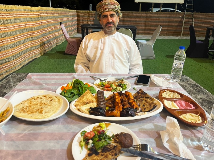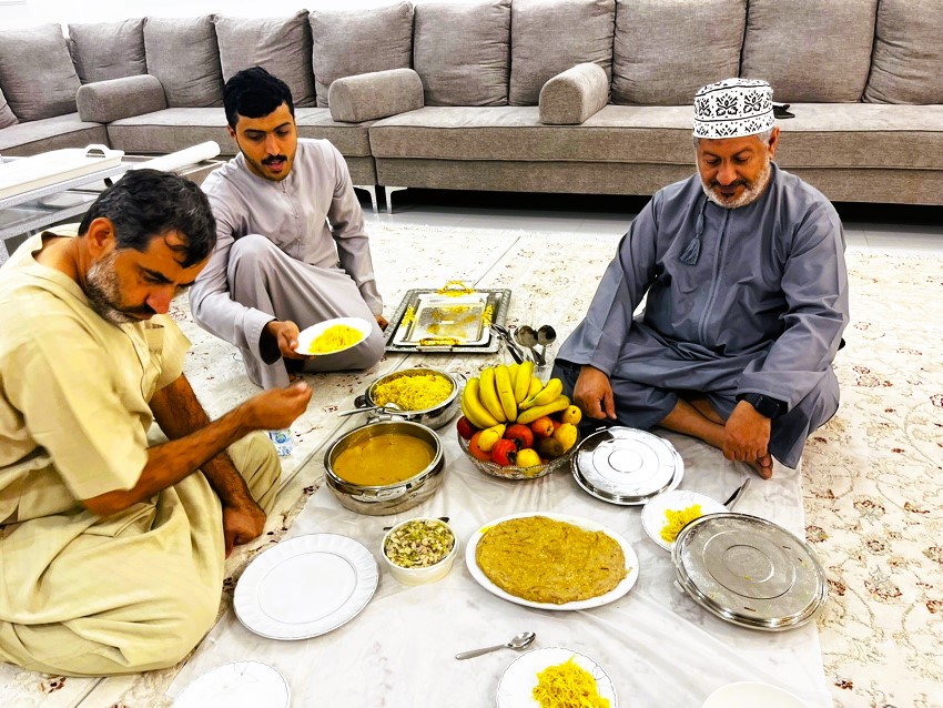 Unser nächstes Ziel war Liwa, nahe der Grenze zu den VAE. Dort wohnt Ahmeds Cousin, bei dem wir übernachteten – inklusive traditionellem Abendessen auf dem Teppich im großen Empfangszimmer. Die meisten Häuser im Oman haben solche Räumlichkeiten. Dieses war etwa 50 qm groß und ringsum mit einer Sitzgelegenheit versehen. Dort werden nur männliche Gäste empfangen und bewirtet. Sowas ähnliches gäbe es aber wohl auch für Frauen.