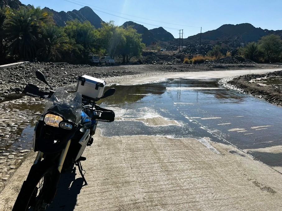 Nach einem Frühstück mit ausgezeichnetem Cappuccino besichtigte ich noch das alte Fort von Nizwa – zumindest kurz, mir war es in voller Motorradmontur am Morgen schon viel zu heiß. Also weiter Richtung Wadi Sumut. Dort passierte es: In einer wassergefüllten Senke rutschte das Vorderrad unvermittelt weg – Moos unter Wasser. Mir ist nichts passiert, die GS trug ein paar Kratzer davon, der linke Handschutz wurde mit einem Kabelbinder notdürftig fixiert.