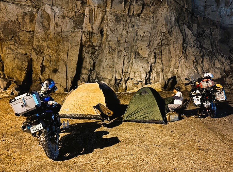 Am nächsten Morgen wurde erneut groß aufgetischt. Nach dem feudalen Frühstück verabschiedeten wir uns vom herzlichen Gastgeber und es folgten mehrere Grenzübertritte. Zuerst zurück in die VAE um nur gut 2 Stunden später wieder in das Sultanat Oman einzutreten. Ein gewaltiger Sandsturm kündigte einen Wetterwechsel an. Es wurde deutlich kühler, und ausgerechnet an unserem Campingtag begann es zu regnen.