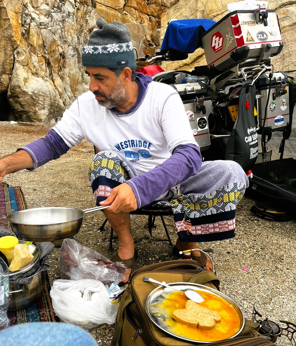 Offizielle Campingplätze gibt es nicht, aber Ahmed kannte einen Platz direkt am Strand. Leider sind omanische Zelte nicht für Regen gemacht. In der Nacht schwamm meine Luftmatratze, sämtliche Kleidung war durchnässt. Als am Morgen der Regen aufhörte lief Ahmed beim Zubereiten des Frühstücks in Hochform auf. Ach, wie ich diesen Kerl mag. 3x am Tag breitet er seinen Gebetsteppich aus und kniet sich nieder zum Gebet gen Mekka.