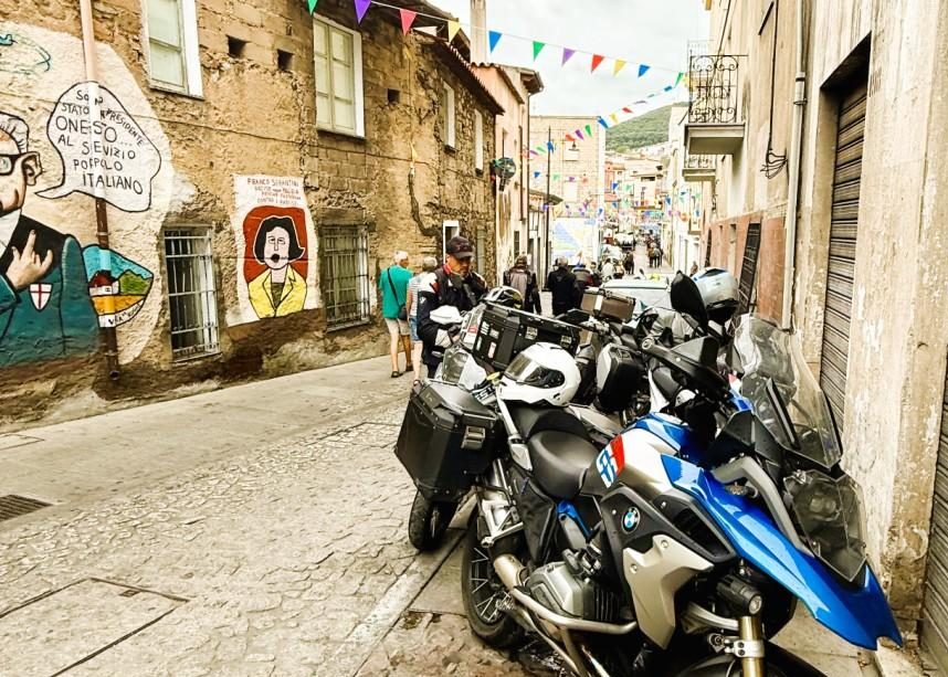 Nach der Ankunft auf der Insel führte uns die Route gleich zu einem kulturellen Highlight: Orgosolo, der bekannte Ort mit seinen unzähligen, eindrucksvollen Wandmalereien. An den Murales parkten unsere GS wie Kunstwerke der anderen Art.